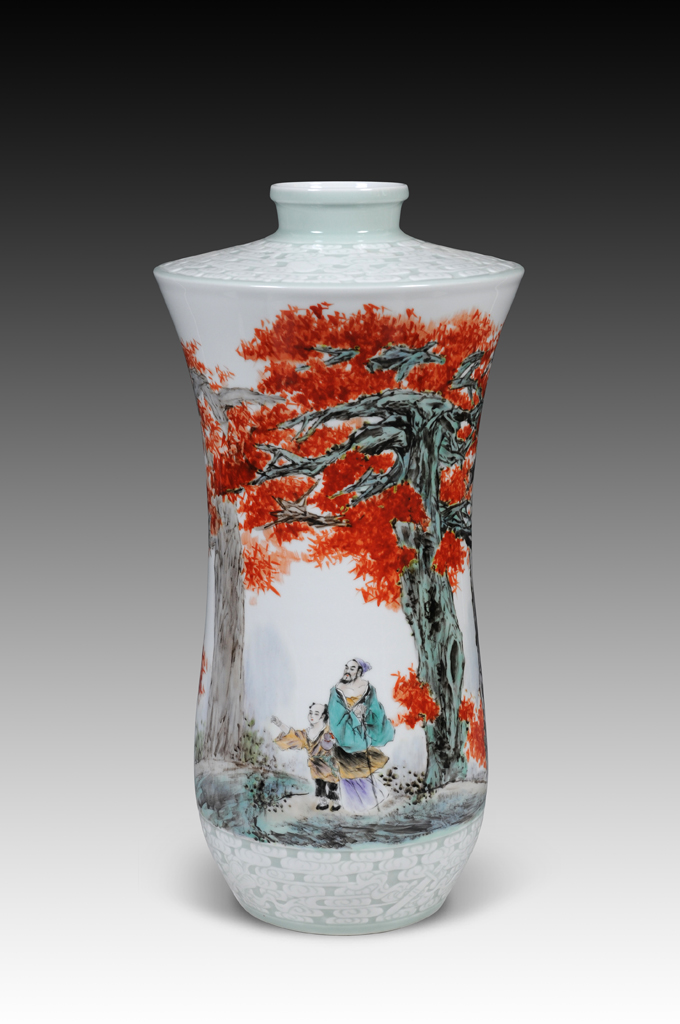 ???? 徐金和??生于江西樂平,江西省陶瓷技能大師,首席技師,江西省高級工藝美術(shù)師,2013年被評選為‘贛鄱英才555工程’人選。江西省五一勞動獎?wù)芦@得者。第二屆景德鎮(zhèn)市僑聯(lián)委員,江西省慈善書畫院院士,景德鎮(zhèn)市優(yōu)秀高技能人才,景德鎮(zhèn)市專業(yè)技術(shù)拔尖人才。江西省職業(yè)技術(shù)學(xué)院客座教授。景德鎮(zhèn)市青年崗位能手。善于運用適度的夸張來強調(diào)人物的神情和意韻,表現(xiàn)手法不落俗套,敢于突破傳統(tǒng)瓷畫的程式,尤其是他的高溫顏色釉窯變?nèi)宋锂嫙呻y度極大,不僅需要畫家具備下筆不誤的畫坯技能,而且還必須具備駕馭易受多種因素制約的多種顏色窯變發(fā)色的能力。
