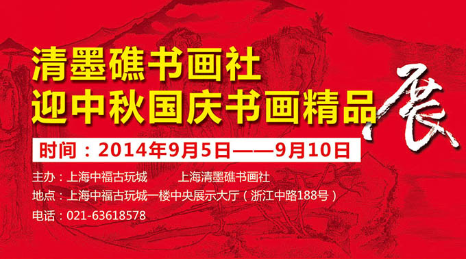 由中國繪畫年鑒、中福古玩城、清墨礁書畫社主辦 ,聯(lián)合國千年發(fā)展目標(biāo)公益活動組織委員會,中國國家美術(shù)家協(xié)會上海市分會,中國國家書法家協(xié)會上海市分會,徐匯區(qū)田林街道,上海智基文化傳播有限公司,欣墨(上海)投資管理有限公司協(xié)辦的“迎國慶書畫精品展”將于9月6號在黃埔區(qū)福州路542號中福古玩城大廳舉行。